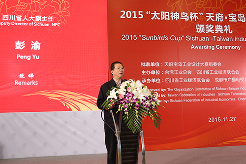 中國臺灣網11月30日成都訊 由臺灣工業總會和四川省工業經濟聯合會聯合主辦的2015“太陽神鳥杯”天府·寶島工業設計大賽,歷時半年時間,日前圓滿落幕。11月27日,在四川成都舉行了頒獎典禮暨創新作品展示交易會。四川省人大常委會副主任彭渝、臺灣工業總會秘書長蔡練生等出席活動并致辭,省人大財經委主任陶生元、省人大外臺僑委主任秦琳、省臺辦主任周敏謙及工信部信息中心、省經信委、省教育廳、省科技廳、省婦聯、團省委等部門負責人,來自全球的10名工業設計大師,川臺兩地企業界、設計界代表以及部分參賽作者出席了頒獎典禮。