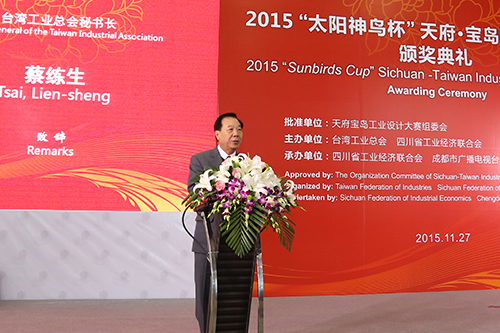 蔡練生在致辭中指出,“太陽神鳥杯”天府.寶島工業設計大賽已成為川臺兩地之間合作交流的一個重要平臺,促進了兩地科技產業的合作進步。他說,天府·寶島工業設計大賽舉辦五年來每年都有進步,期待大賽一年比一年辦得更好。他表示,臺灣工業總會將繼續致力于與四川方面共同推動兩地科技創新成果的轉化。