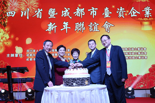 四川省臺(tái)辦主任周敏謙(左一)、成都市委常委陳建輝(左二)、中國(guó)國(guó)民黨前副主席洪秀柱(中)、成都臺(tái)協(xié)會(huì)長(zhǎng)徐大偉(右二)、全國(guó)臺(tái)企聯(lián)榮譽(yù)會(huì)長(zhǎng)張漢文(右一)共切新年蛋糕送祝福。