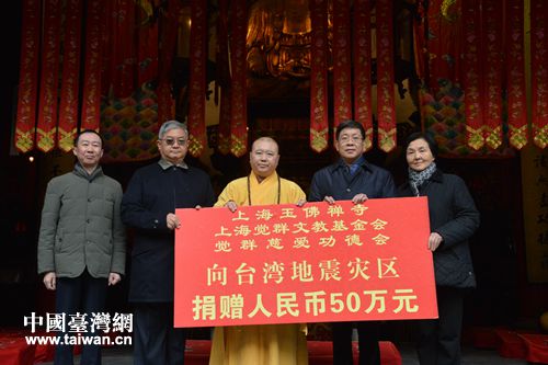 上海玉佛禪寺向臺灣地震災區捐款。(上海市臺辦 葛鳳章 攝)
