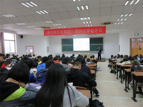 中國臺灣網10月29日常州訊 為幫助在常大學生更好地掌握涉臺知識,理解中央對臺工作的方針政策,積極參與兩岸青少年交流交往活動,江蘇常州市臺辦從今年下半年起,將持續開展“涉臺知識進高校”活動。10月27日下午,由常州市臺辦、團市委與常州大學商學院聯合舉辦的“涉臺知識進高校——常州大學站活動”在常大白云校區成功舉行。