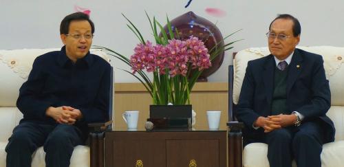 圖為楊峰主任會見泰國華僑協(xié)會主席、世界臺商聯(lián)合總會名譽總會長余聲清。