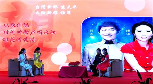 “你我風風雨雨守護一個圈,把愛團團圓圓圍在心里面”,主題聯誼活動在臺灣藝人熊天平、楊洋夫婦動人的歌聲中拉開序幕。一個是才華橫溢的臺灣藝人,他的《火柴天堂》、《夜夜夜夜》等歌曲膾炙人口;一個是熱情奔放的北方妹子,也是一名創作型歌手。對音樂共同的熱愛讓熊天平和楊洋彼此牽手,并喜得一對龍鳳雙胞胎。談到婚姻的相處之道,楊洋說就是六個字“求大同,存小異”。她說:“我擅長粗獷的‘大歌’,他擅長細膩的情歌,這和我倆的性格也很相似,我大氣些,他細致些,這讓我們在工作和生活中起到很好的互補作用。”成長環境和思維方式的差異難免會讓婚姻產生摩擦,楊洋表示音樂是最好的“潤滑劑”,“一言不和就唱歌,唱著唱著,矛盾就漸漸消除了”。而熊天平認為“溝通”是婚姻中最重要的部分。兩岸婚姻有許多需要互相學習的方面,夫妻間更要包容和忍讓,他笑言“老婆說的即使不合理的也是合理的”。訪談中,熊天平溫文爾雅,話不多,楊洋則是快人快語,如同她身上的靚麗紅衫。當兩人現場清唱起那首耳熟能詳的《你的眼睛》時,濃濃愛意融化了在場所有人。