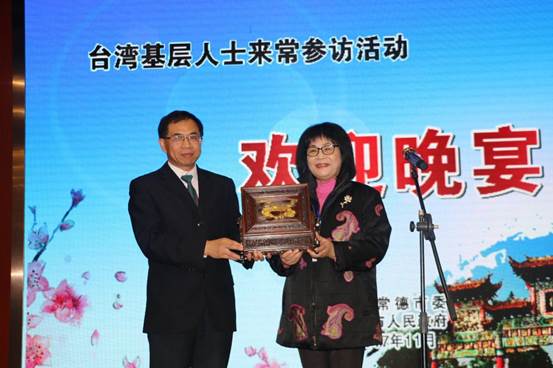陳位明副主席與侯彩鳳女士互贈禮品。(圖片來源:常德市臺辦)