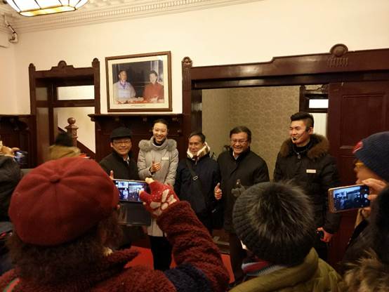 來(lái)自臺(tái)灣新竹縣五峰鄉(xiāng)清泉的張學(xué)良文化園區(qū)的解說(shuō)員蔣廣生先生(中)第一次來(lái)到沈陽(yáng)張氏帥府博物館,聆聽(tīng)張學(xué)良事跡,與講解員親密合影。