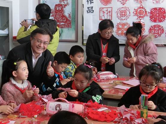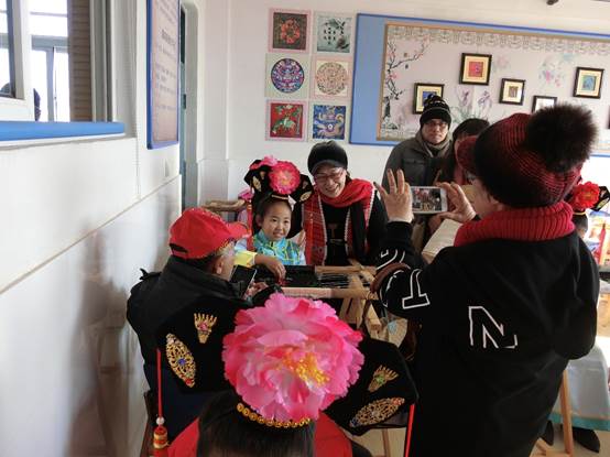 在撫順新賓永陵滿族小學(xué),團(tuán)員們走進(jìn)滿語(yǔ)課堂,并觀看了滿族傳統(tǒng)技藝刺繡、剪紙、舞蹈教學(xué)展示。