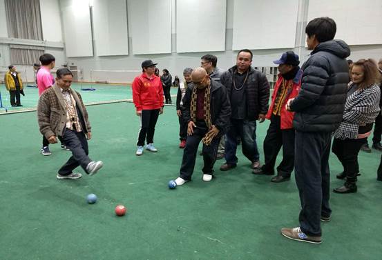在體育館,臺(tái)灣少數(shù)民族代表“現(xiàn)學(xué)現(xiàn)賣(mài)”,較量起了滿族蹴球