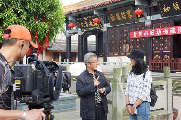 什邡文史專家郭輝圖(中)向記者介紹馬祖道一農(nóng)禪文化