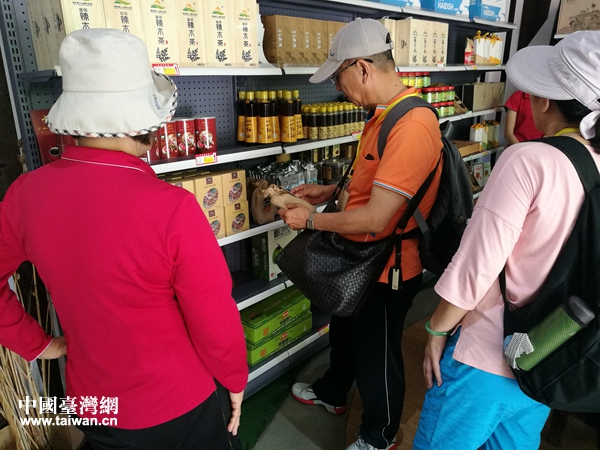 參訪團(tuán)成員在特色農(nóng)產(chǎn)品展示中心挑選商品。(圖片來(lái)源:海南省臺(tái)辦)