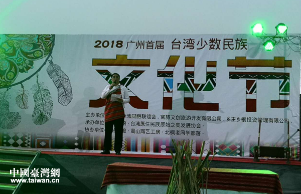 中國臺灣網(wǎng)5月8日廣州訊 日前,由廣州市臺灣同胞聯(lián)誼會、窩旅文創(chuàng)旅游開發(fā)有限公司、鄉(xiāng)土鄉(xiāng)根投資管理有限公司聯(lián)合主辦的 “廣州首屆臺灣少數(shù)民族文化節(jié)”在廣州市番禺區(qū)開幕。臺灣立法機構(gòu)民意代表、臺灣原住民族生存發(fā)展協(xié)會理事長孔文吉專程從臺灣飛赴廣州參加開幕式,廣州市臺聯(lián)會長葉耀華、臺灣原住民族從業(yè)者代表、臺灣嘉賓、在穗臺商代表以及省、市、番禺區(qū)臺辦有關(guān)負責(zé)人共100余人參加了開幕式。
