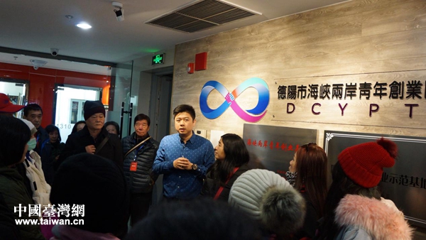 許淵順(中)為到訪德陽青創園的臺灣同胞介紹園區發展情況。(圖片來源:四川省臺辦)