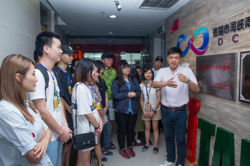 德陽市海峽兩岸青年創(chuàng)業(yè)園負責人、青年臺商許淵順向臺灣青年介紹園區(qū)創(chuàng)新創(chuàng)業(yè)情況。(四川省臺辦供圖)