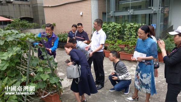 “隨手環(huán)保,財(cái)源穩(wěn)保”、“綠色大地,生命永續(xù)”、“紙張勿浪費(fèi),綠樹(shù)誠(chéng)可貴”……臺(tái)北市中山區(qū)劍潭里社區(qū)服務(wù)中心大樓的每一級(jí)階梯,都貼著這樣的環(huán)保小格言。在這里,參訪團(tuán)一行參觀了太陽(yáng)能板、中水回收系統(tǒng)、市民農(nóng)園、節(jié)能燈具汰換等低碳設(shè)施并在生態(tài)小院澆灌生態(tài)小黃瓜并采摘品嘗。