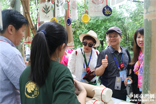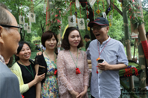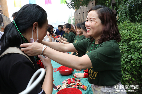 工作人員向參加活動(dòng)的民眾佩戴用艾草制作的福包。(中國(guó)臺(tái)灣網(wǎng) 郜利敏 攝)