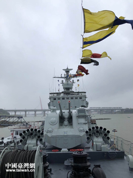 艦上八一軍旗迎風(fēng)飄揚(yáng)。(中國(guó)臺(tái)灣網(wǎng) 許秋玥 攝)