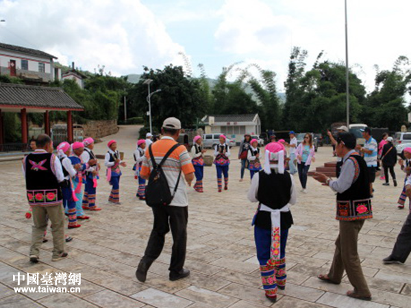 參訪團(tuán)成員與峨山縣擺依寨群眾共同跳起民族舞蹈。(圖片來源:玉溪市臺(tái)辦、新平縣臺(tái)辦、峨山縣臺(tái)辦)