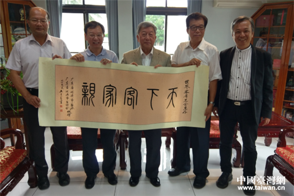 6月20日,參訪團向世界客屬總會榮譽理事長邱鏡淳先生贈送紀念品。(圖片來源:河源市臺辦)