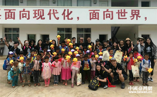 兩岸愛心人士與華坪縣新陽小學(xué)學(xué)生合影。(圖片來源:云南省臺辦 葉春祿 攝)