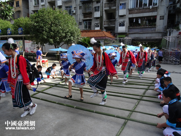廣西河池市金城江區(qū)第三小學(xué)學(xué)生以竹竿舞迎接臺(tái)灣花蓮縣新城鄉(xiāng)北埔小學(xué)師生們的到來(lái)。(圖片來(lái)源:廣西河池市金城江區(qū)臺(tái)辦)