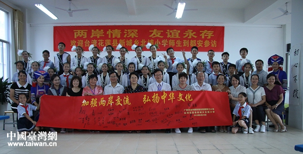 圖為臺(tái)灣參訪團(tuán)與河池市臺(tái)辦領(lǐng)導(dǎo)、安陽(yáng)三小師生代表合影。(圖片來源:廣西河池市都安縣臺(tái)僑辦)
