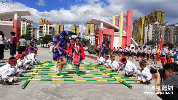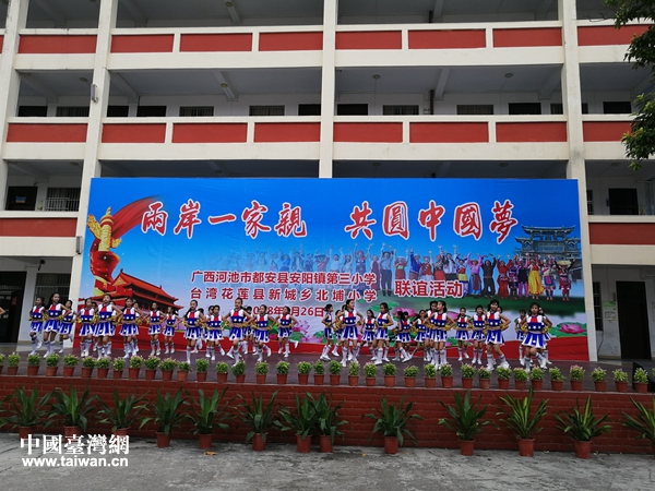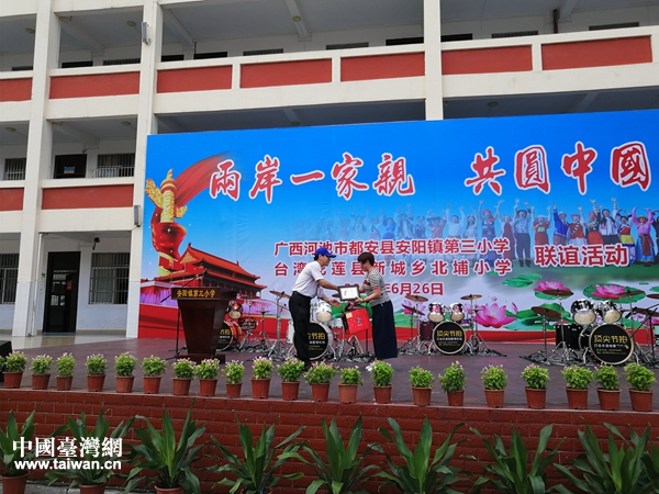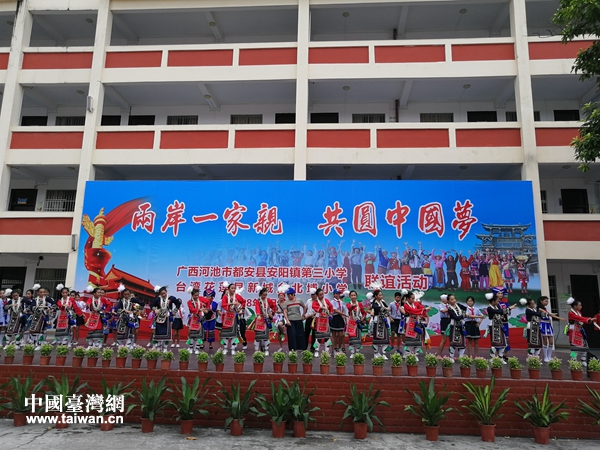 中國(guó)臺(tái)灣網(wǎng)7月2日河池訊 6月26日,激昂的鼓點(diǎn)、優(yōu)雅的歌聲、臺(tái)灣少數(shù)民族韻味的音樂、氣勢(shì)如虹的武術(shù)表演叱喝聲、歡快的笑聲和掌聲,在廣西河池市都安縣安陽(yáng)鎮(zhèn)第三小學(xué)校園內(nèi)蕩漾,這是臺(tái)灣花蓮縣新城鄉(xiāng)北埔小學(xué)師生一行30人到該校開展聯(lián)誼交流活動(dòng)的歡樂場(chǎng)景。