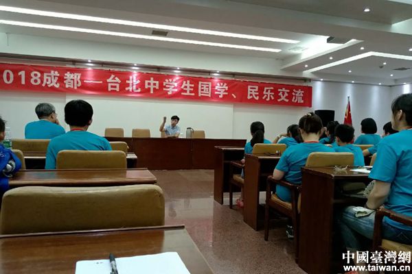 中國臺灣網7月10日成都訊 當國學交織民樂、當臺北遇上成都、當臺灣學生牽手成都學生會迸發出什么樣的火花?會有什么不一樣的故事?2018年7月5日至10日,來自臺北市中正中學師生一行60人,帶著笙、笛、揚琴、柳琴、二胡、琵琶等樂器到訪成都,通過聽國學知識講座、瞻詩圣故居、詠經典詩詞、看館藏文物、學演奏技藝、合辦音樂會等豐富多彩的活動,開展中學生國學民樂交流,推展國學文化,演繹音樂藝術。