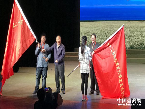 楊逢春副省長(zhǎng)和臺(tái)灣退役將領(lǐng)夏瀛洲向兩岸大學(xué)生代表授旗。(圖片來(lái)源:青海省臺(tái)辦)