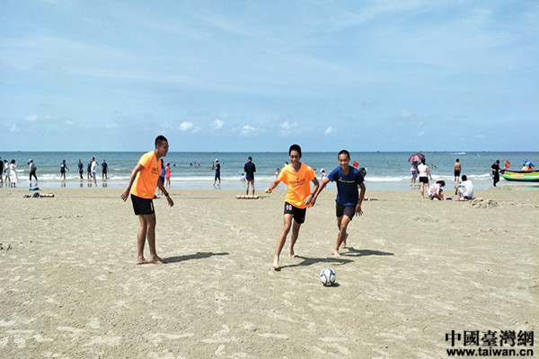 同學(xué)們?cè)诒焙cy灘上踢“沙灘足球”(圖片來(lái)源:北海市臺(tái)辦)