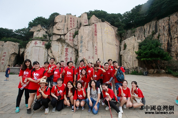 參加暑學(xué)營(yíng)的兩岸青年登上泰山。(圖片來(lái)源:山東省臺(tái)辦)