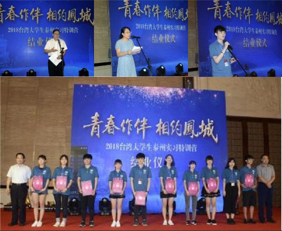 2018臺灣大學生泰州實習特訓營結營儀式上,領導和代表學生講話并合影留念。(圖片來源:泰州市臺辦)