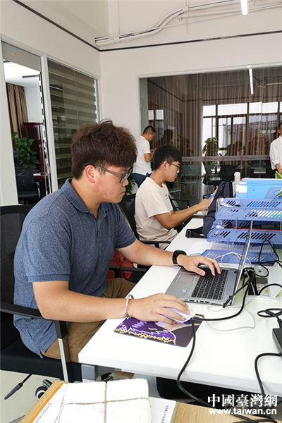 臺灣大學資訊管理學碩士韓宏光(右)和臺灣中華大學機械系本科生黃傳恩(左)在聯(lián)通東南研究院實習。(中國臺灣網(wǎng) 郜利敏 攝)