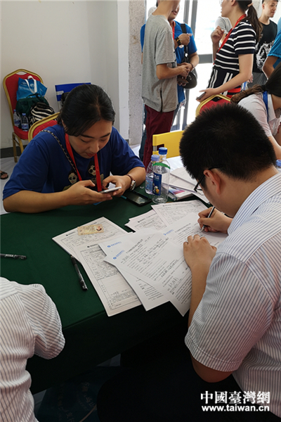 為了讓更多學生體驗移動支付,今年組委會邀請中國移動公司、海峽銀行工作人員在營地聯合辦公,便捷臺青開通移動支付。基于辦理人數激增,中國移動公司和海峽銀行工作人員10日也增添了1組工作人員,以便快速幫助臺青辦理移動支付。