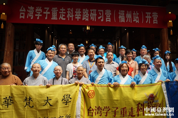 中國臺灣網8月24日福州訊 8月23日上午,“臺灣學子重走科舉路研習營”的學子們身穿古裝在福州正誼書院內參加了一場別開生面的“鄉試”,親身體驗臺灣士子參加科舉考試的歷史情景。北京市臺聯名譽會長盧咸池、副會長王慧,福州市臺聯會長林鴻榕、副調研員許峰,臺灣華梵大學前校長高柏園,臺灣銘傳大學廣播電視學系主任杜圣聰等嘉賓出席活動。