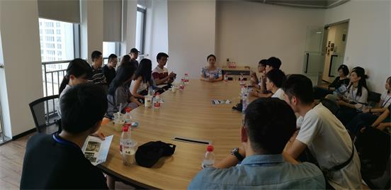 圖為聯(lián)盈創(chuàng)客園參觀時(shí),青年創(chuàng)業(yè)臺(tái)商鄭欣怡與臺(tái)灣實(shí)習(xí)大學(xué)生交流創(chuàng)業(yè)經(jīng)驗(yàn)。