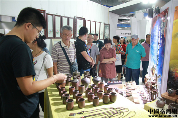 陶瓷茶罐、柴燒杯、鎏金牡丹荷口瓶、創(chuàng)意茶壺、瓷板畫等臺灣特色展品引來市民駐足圍觀,也有聞訊而來的客商現(xiàn)場聯(lián)絡(luò)洽談合作。