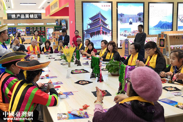 體驗土族盤繡制作。(圖片來源:青海省臺辦)