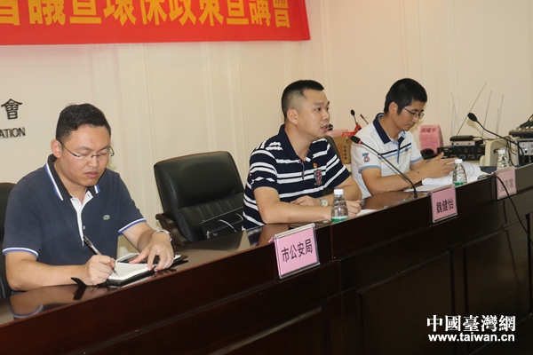 中山市公安局審批辦常務副主任魏健怡(中)、治安管理支隊戶政大隊副大隊長溫燕嵩(右)為中山市臺商投資企業協會理監事宣講居住證申辦流程。(圖片來源:廣東省臺辦)