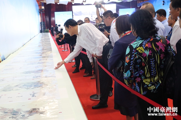 與會嘉賓欣賞兩岸著名書畫家共同繪制的百米長卷。(中國臺灣網(wǎng) 張露露 攝)