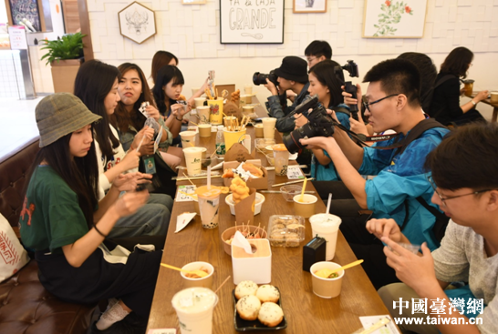 采訪團(tuán)在群光廣場(chǎng)享受臺(tái)灣美食與成都名小吃。(圖片來源:四川省臺(tái)辦)