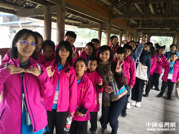 臺(tái)灣花蓮縣卓溪太平小學(xué)師生在三江冠小侗寨體驗(yàn)民族風(fēng)情。(圖片來(lái)源:廣西臺(tái)辦)