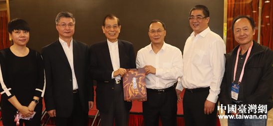 廣州市委常委、統(tǒng)戰(zhàn)部長盧一先與世界華商組織聯(lián)盟丁楷恩主席交換紀(jì)念品。(廣州市臺聯(lián) 駱源 攝)