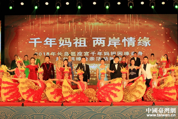 9月27日晚,“千年媽祖·兩岸情緣—2018年長(zhǎng)島顯應(yīng)宮千年媽祖因緣金身赴臺(tái)結(jié)緣會(huì)親”活動(dòng)晚會(huì)在長(zhǎng)島明珠廣場(chǎng)成功舉辦。近千名海島居民、媽祖信眾到現(xiàn)場(chǎng)觀看。晚會(huì)在此次赴臺(tái)結(jié)緣會(huì)親活動(dòng)宣傳片中盛大開(kāi)場(chǎng),女聲獨(dú)唱《媽祖頌》、舞蹈《娘娘賜燈》、《天佑之光》、《闖海漢子》等節(jié)目展現(xiàn)出媽祖民心安愿,福蔭盛世的場(chǎng)面;舞蹈《海島明珠》《漁家號(hào)子》《歡樂(lè)漁家》等節(jié)目展示了長(zhǎng)島碧海藍(lán)天、旖旎的海景風(fēng)光和海鮮美食的饕餮盛宴。精彩的晚會(huì)表演贏得了現(xiàn)場(chǎng)觀眾的陣陣掌聲。29日上午,媽祖金身順利抵達(dá)廟島顯應(yīng)宮并舉行了回鑾安坐儀式,圓滿完成了這“千年等一回”的盛大壯舉,為本次“2018年長(zhǎng)島顯應(yīng)宮千年媽祖赴臺(tái)結(jié)緣會(huì)親”活動(dòng)畫(huà)上圓滿句號(hào)。