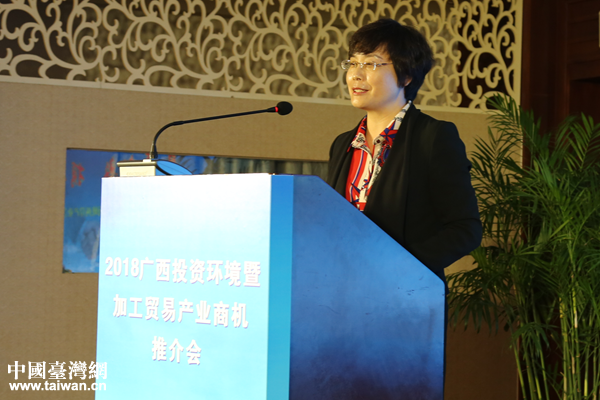中國臺灣網(wǎng)11月12日蘇州訊 11月6日,“2018年廣西投資環(huán)境暨加工貿(mào)易產(chǎn)業(yè)商機(jī)推介會”在江蘇省蘇州市舉辦,廣西臺辦主任李東興作推介發(fā)言,向與會120多家臺資企業(yè)負(fù)責(zé)人推介廣西海峽兩岸產(chǎn)業(yè)合作區(qū)的規(guī)劃背景、區(qū)域范圍、發(fā)展定位、發(fā)展目標(biāo)、突出優(yōu)勢、合作領(lǐng)域和優(yōu)惠政策。