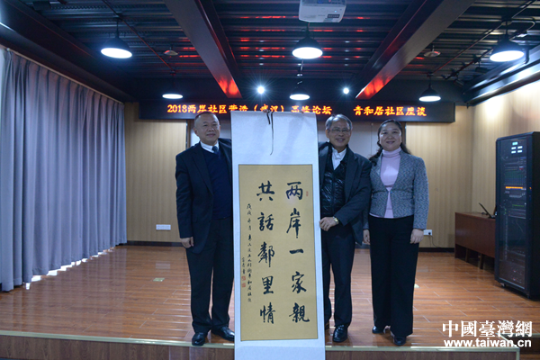 贈送“兩岸一家親·共話鄰里情”的書法作品。(武漢市臺辦 劉宇 攝)