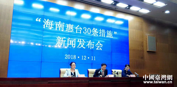 中國(guó)臺(tái)灣網(wǎng)12月11日海口訊 12月11日,在“海南惠臺(tái)30條措施”新聞發(fā)布會(huì)上,海南省發(fā)布了《中共海南省委統(tǒng)一戰(zhàn)線工作部 海南省發(fā)展和改革委員會(huì) 貫徹落實(shí)〈關(guān)于促進(jìn)兩岸經(jīng)濟(jì)文化交流合作的若干措施〉實(shí)施意見》(簡(jiǎn)稱“海南30條惠臺(tái)措施”)。“海南30條惠臺(tái)措施”的出臺(tái)旨在深入貫徹黨的十九大精神和習(xí)近平總書記關(guān)于對(duì)臺(tái)工作重要論述,與臺(tái)灣同胞分享建設(shè)中國(guó)(海南)自由貿(mào)易試驗(yàn)區(qū)、中國(guó)特色自由貿(mào)易港發(fā)展機(jī)遇,讓臺(tái)灣同胞在海南投資、創(chuàng)業(yè)、就業(yè)、學(xué)習(xí)和生活有更多的獲得感。