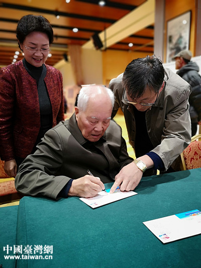 鄭堅在兩岸通郵十周年紀念郵票和郵封簽字留念。(中國臺灣網 郜利敏 攝)
