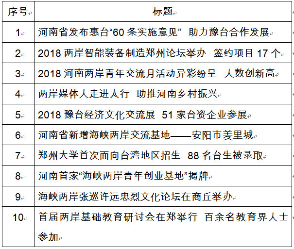 為了進(jìn)一步宣傳河南省對臺工作所取得的成就,激發(fā)社會各界對對臺工作關(guān)心、支持和參與熱情,河南省臺辦辦于去年12月28日正式在全省范圍內(nèi)開展了“2018年河南省涉臺十大新聞”評選活動。結(jié)合網(wǎng)絡(luò)投票結(jié)果,綜合各方面意見,現(xiàn)將“2018年河南省涉臺十大新聞”評選結(jié)果公布如下:
