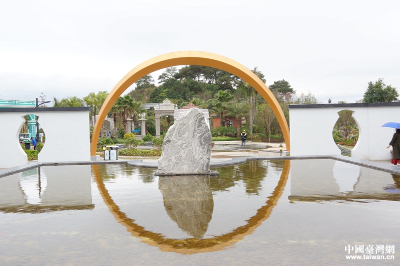 在臺灣園,一同參加游覽的臺灣設計團隊介紹了臺灣園的臺前幕后故事。總設計師葉輝義表示,臺灣園以“筑夢臺灣園”為主題,突出“生態、文化、共享”特色,以臺灣閩南三合院為核心主軸,將臺灣城鄉肌理、風土人情、原鄉原味作為副線,把水、石、木、竹等自然元素融入禪宗文化和蝴蝶蘭風情。采用鏡面水池設計,通過倒影把入口處的金色大拱門組合成一個圓,將形似臺灣島的奇石及倒影環抱在圓中,烘托出團團圓圓的意境,是桂臺同胞集體的智慧結晶。