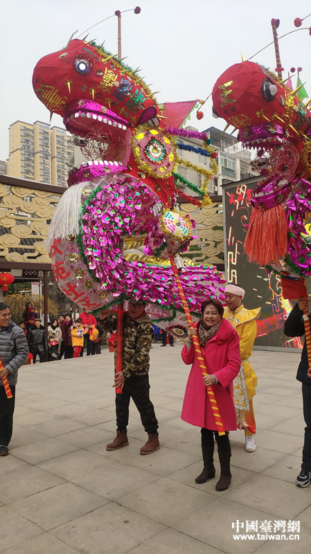參訪團在江欣苑社區體驗高龍。(圖片來源:武漢市臺辦 王瑋 攝)