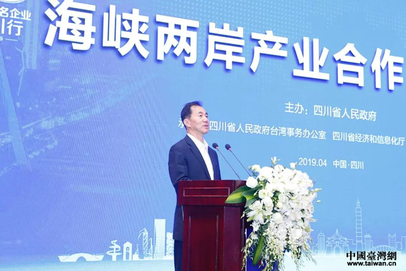 中國臺灣網4月25日訊 4月23日,由四川省臺辦承辦的“走進海峽兩岸產業合作區”活動在四川成都舉行。作為“2019中外知名企業四川行活動”的重要組成部分,活動共包括“海峽兩岸產業合作區推介會”和“知名臺商臺企眉山行”。來自臺灣工商協進會、臺灣工商企業聯合會等臺灣電子信息產業知名企業及行業協會負責人,四川省直部門及相關市負責人近150人參加推介會。